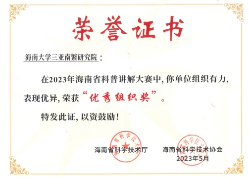 5月13日,2023年海南省科普讲解大赛圆满收官。本次比赛由海南省科学技术厅、海南省科学技术协会主办,中国热带农业科学院香料饮料研究所承办。以“热爱科学 崇尚科学”为主题,旨在通过科普讲解大赛在全社会普及科学知识、倡导科学方法、传播科学思想、弘扬科学精神,激发全社会创新创业活力,让科技发展成果更广泛的惠及和服务人民。在省内赛中,公司荣获2023海南省科普讲解大赛“优秀组织奖”。